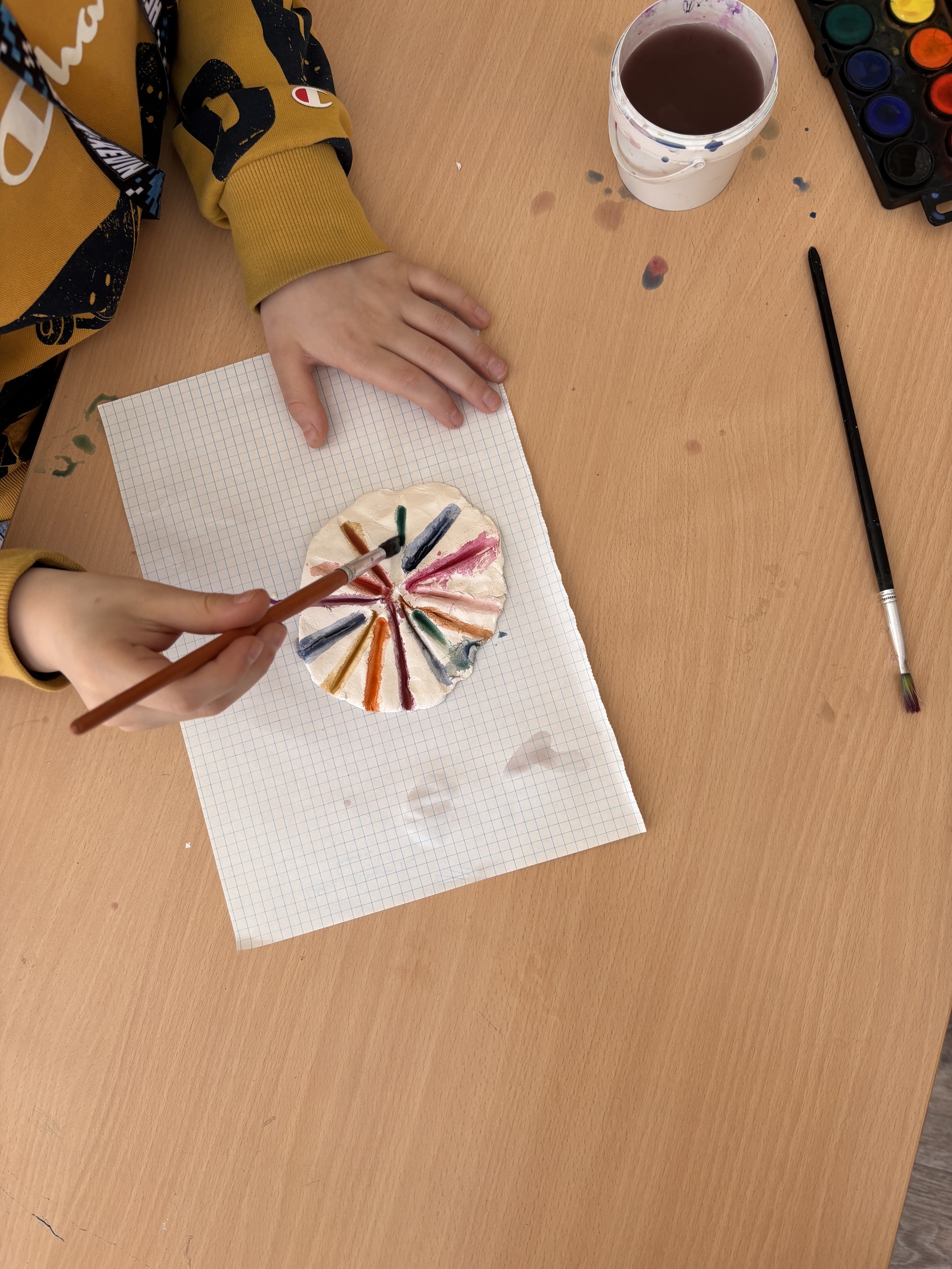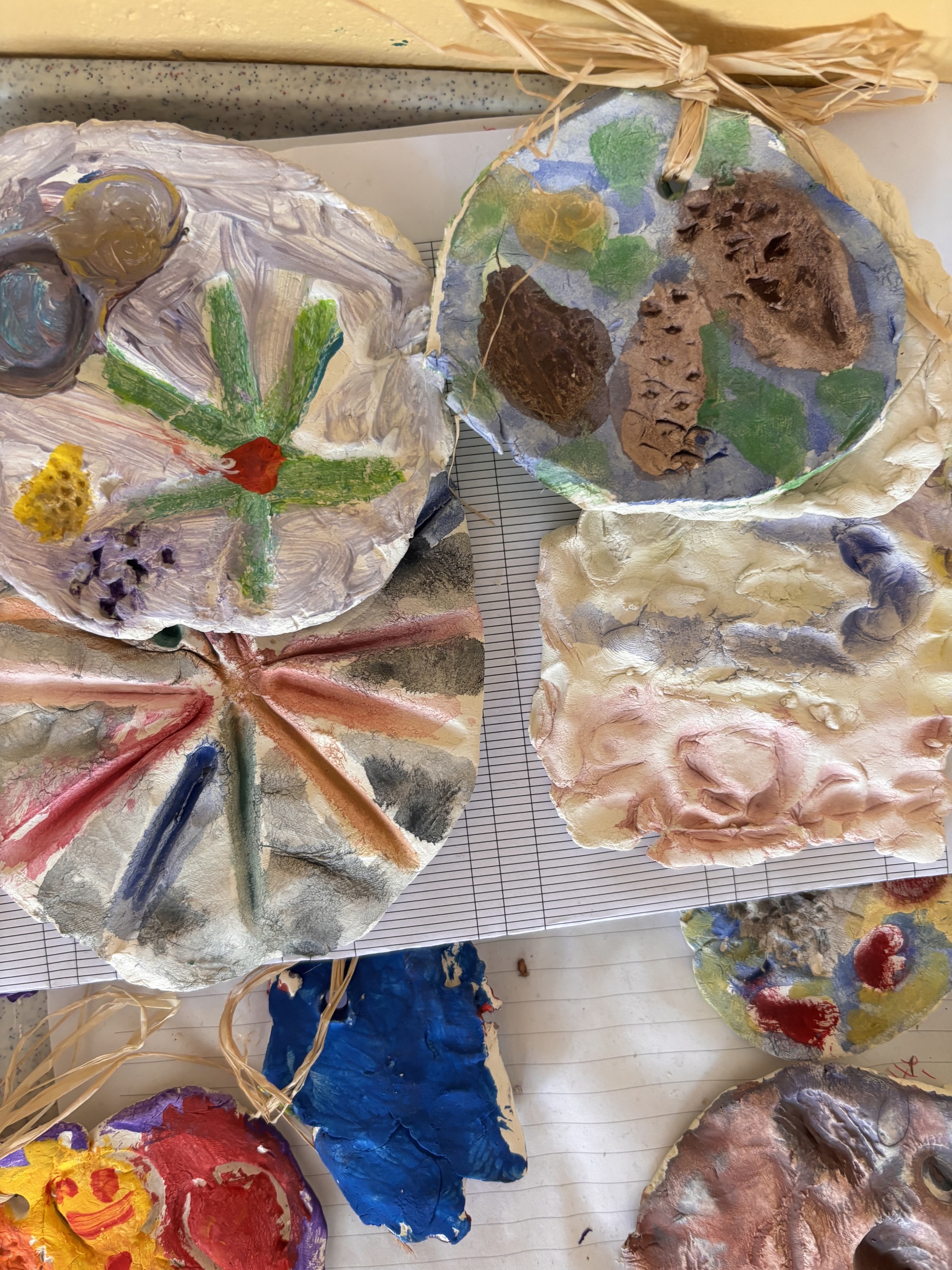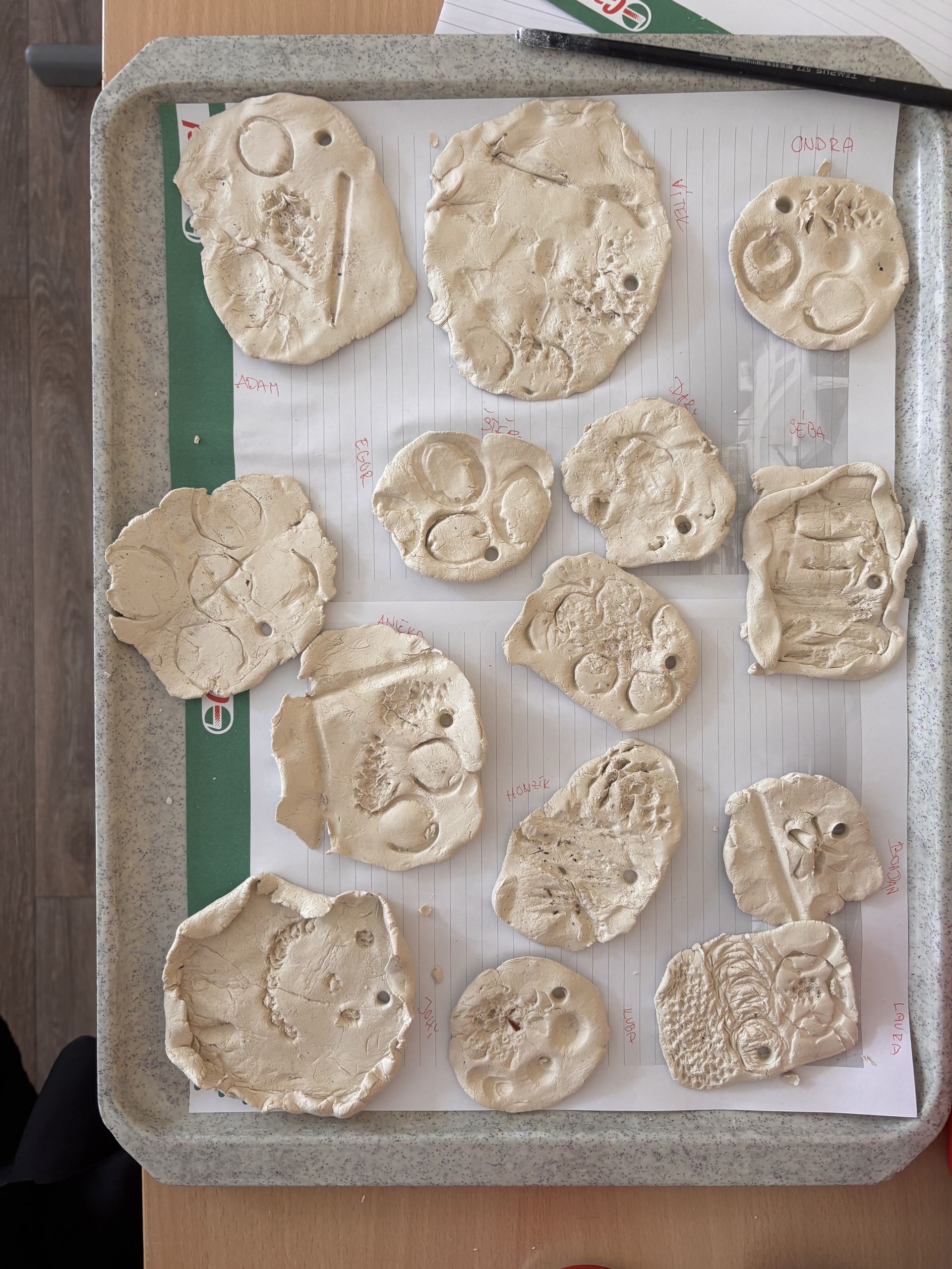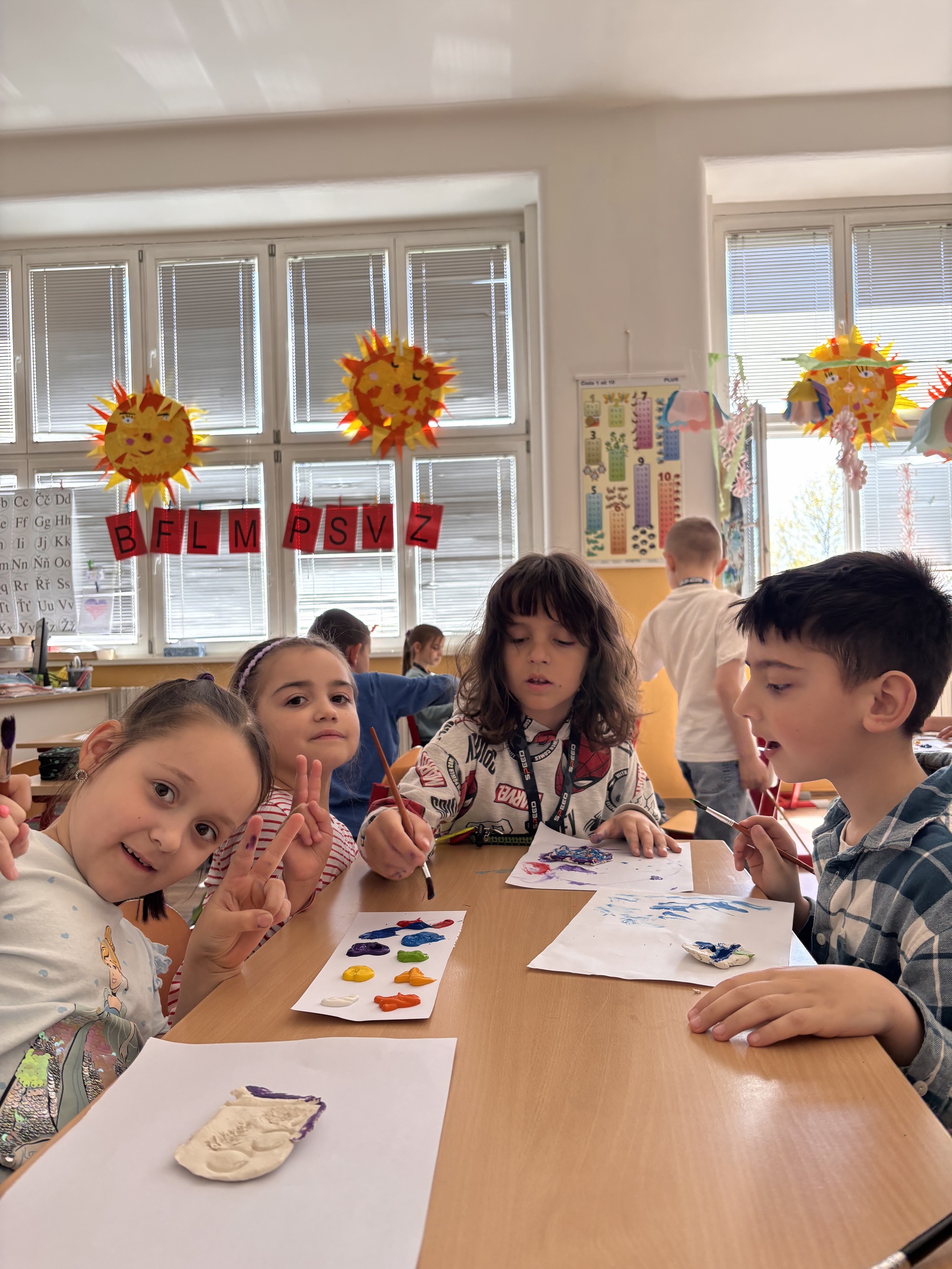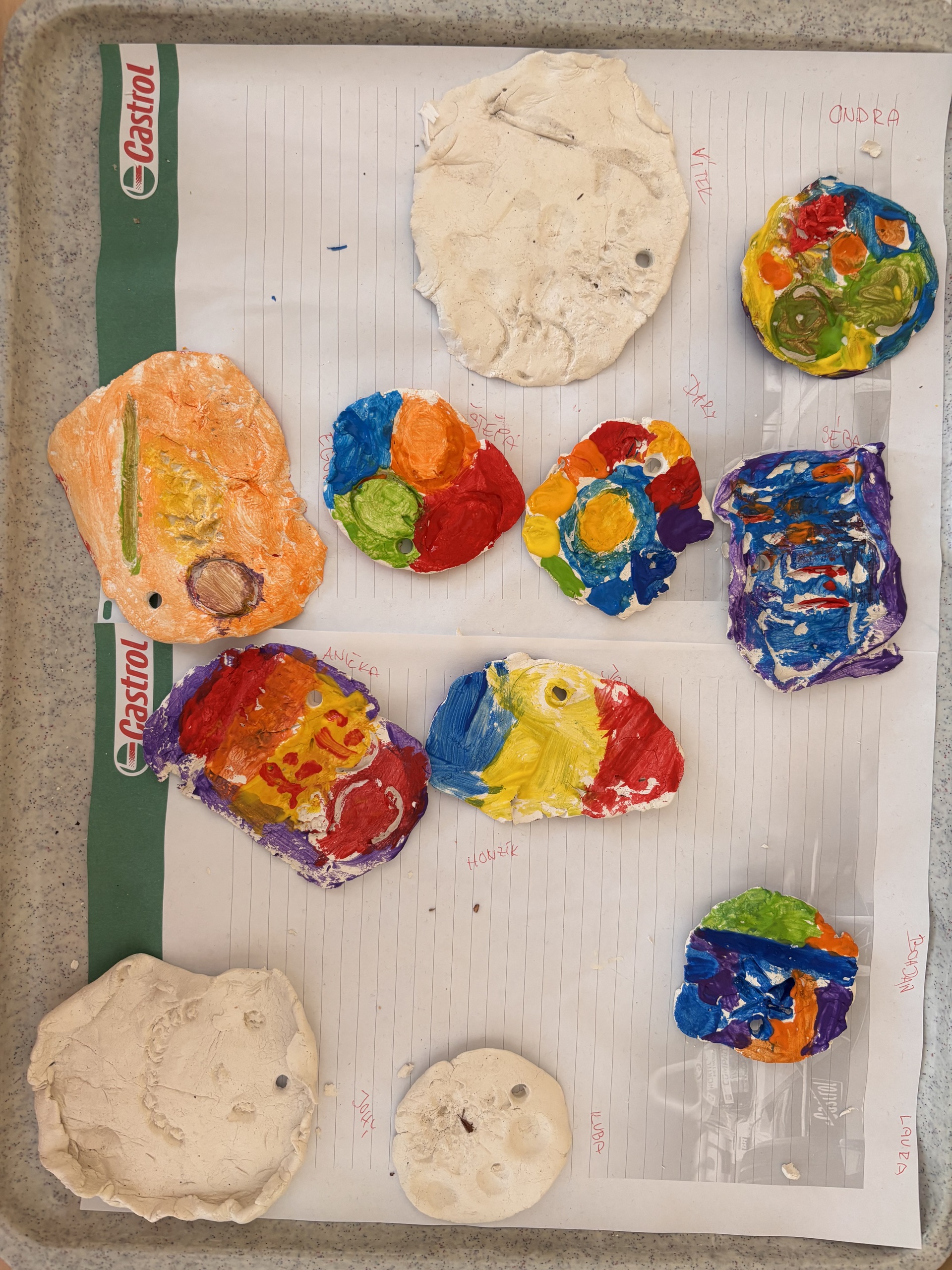 Nasbírané přírodniny jsme následně využili při výtvarné činnosti. Děti je obtiskávaly do keramické hmoty a vytvářely tak originální jarní medailonky. Každý výrobek byl jedinečný a nesl v sobě otisk skutečné přírody. Po zaschnutí si děti své medailonky vybarvily podle vlastní fantazie, čímž vznikla pestrá a nápaditá kolekce.