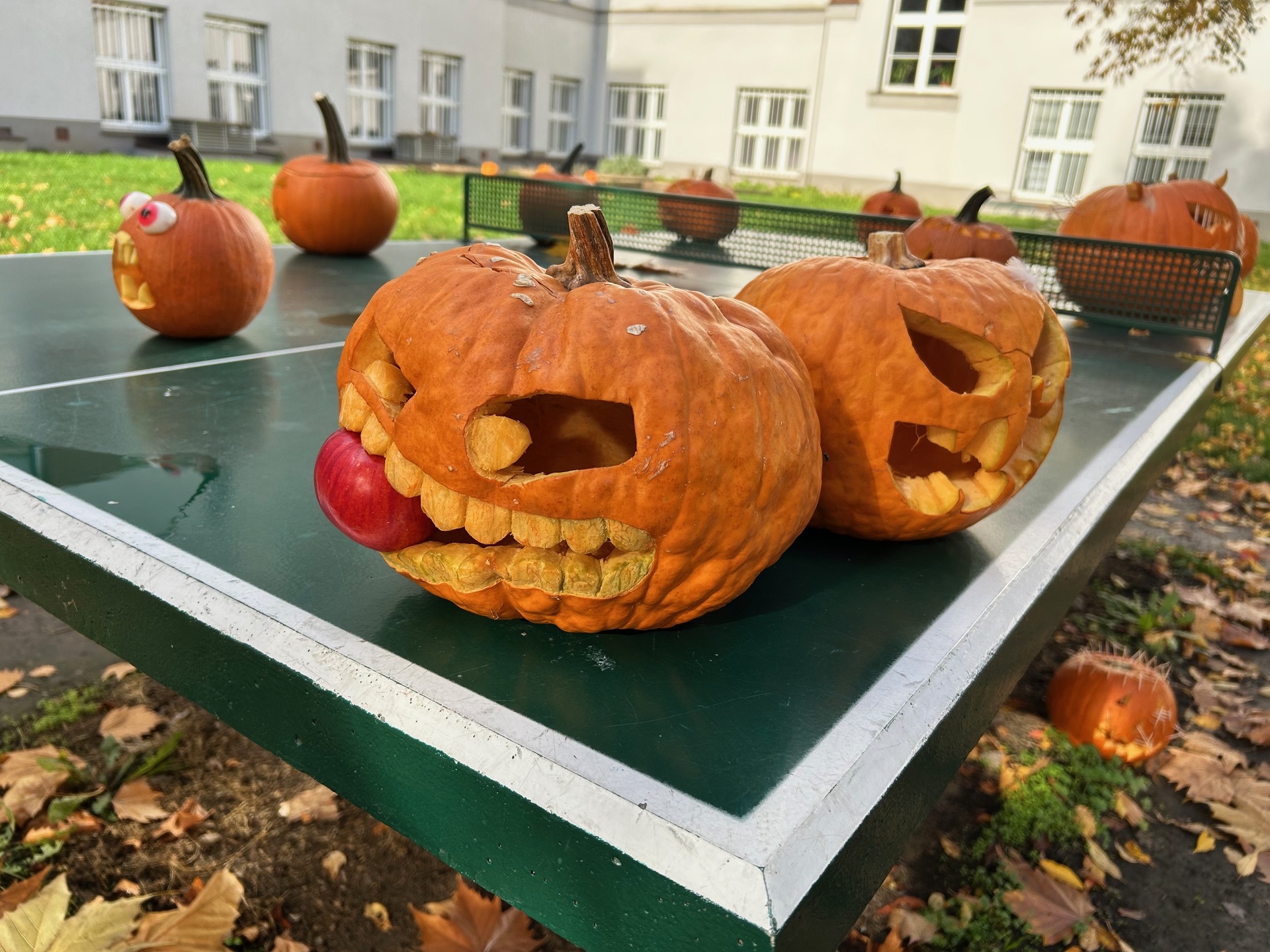 Nejen žáci, ale i jejich rodiče významně přispěli k letošnímu Halloweenu. Mnozí z nich vyslechli výzvu pana ředitele a přinesli vlastnoručně vyřezanou dýni, která zkrášlila školní dvůr. Bezmála 80 originálně zpracovaných dýní pohádkově proměnilo prostor před budovou školy. Děkujeme!