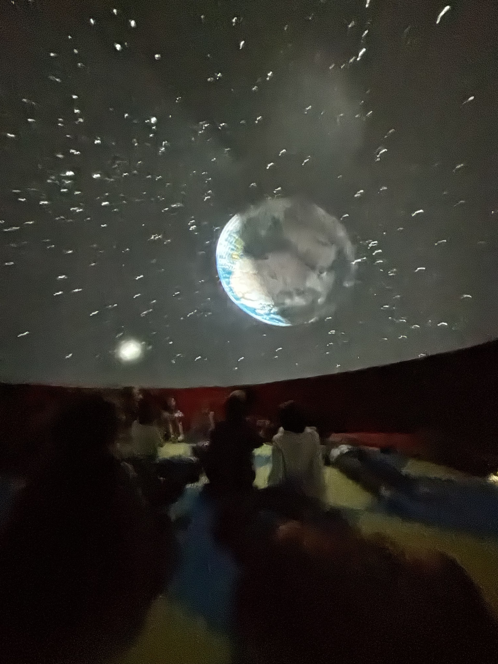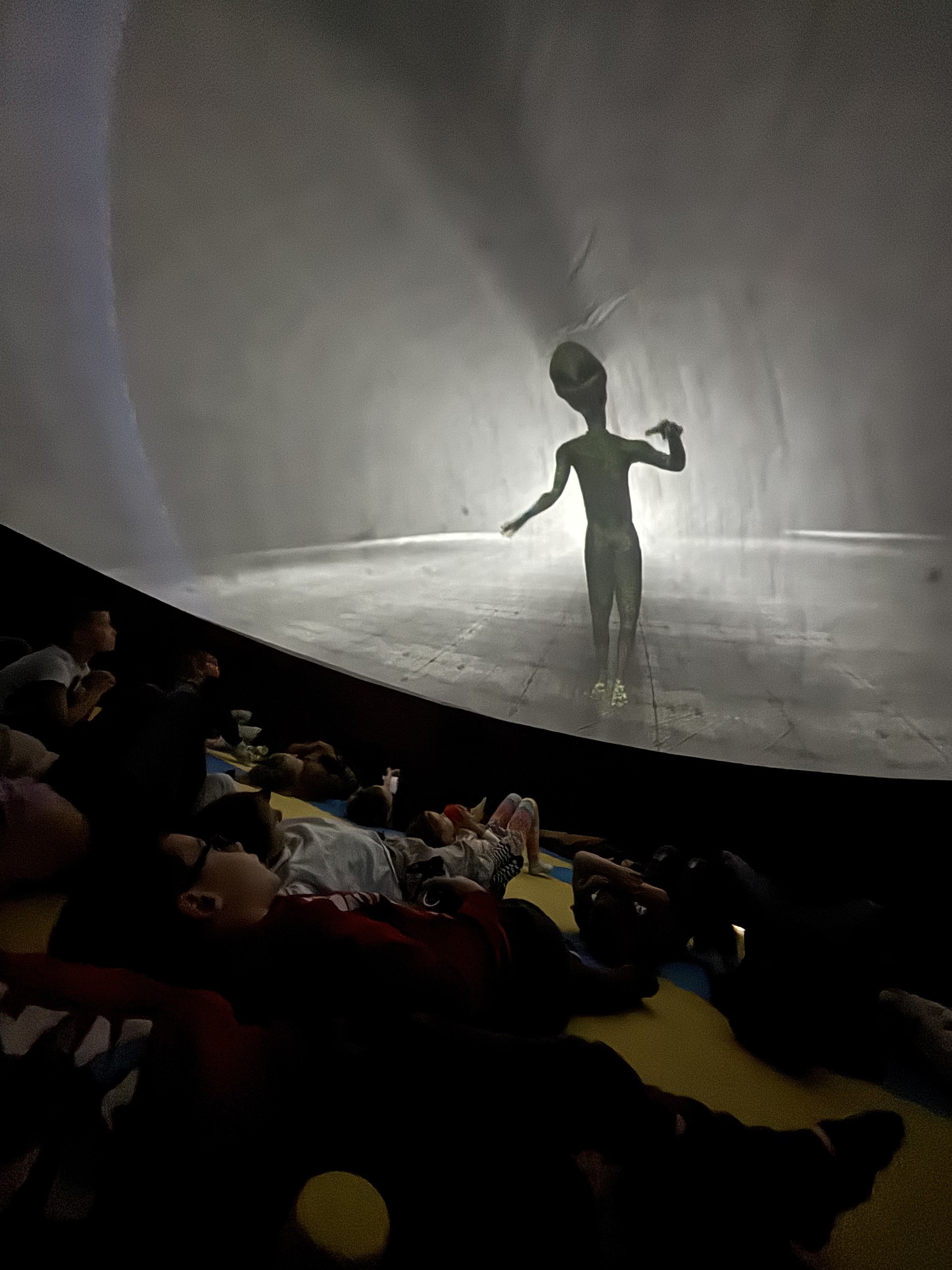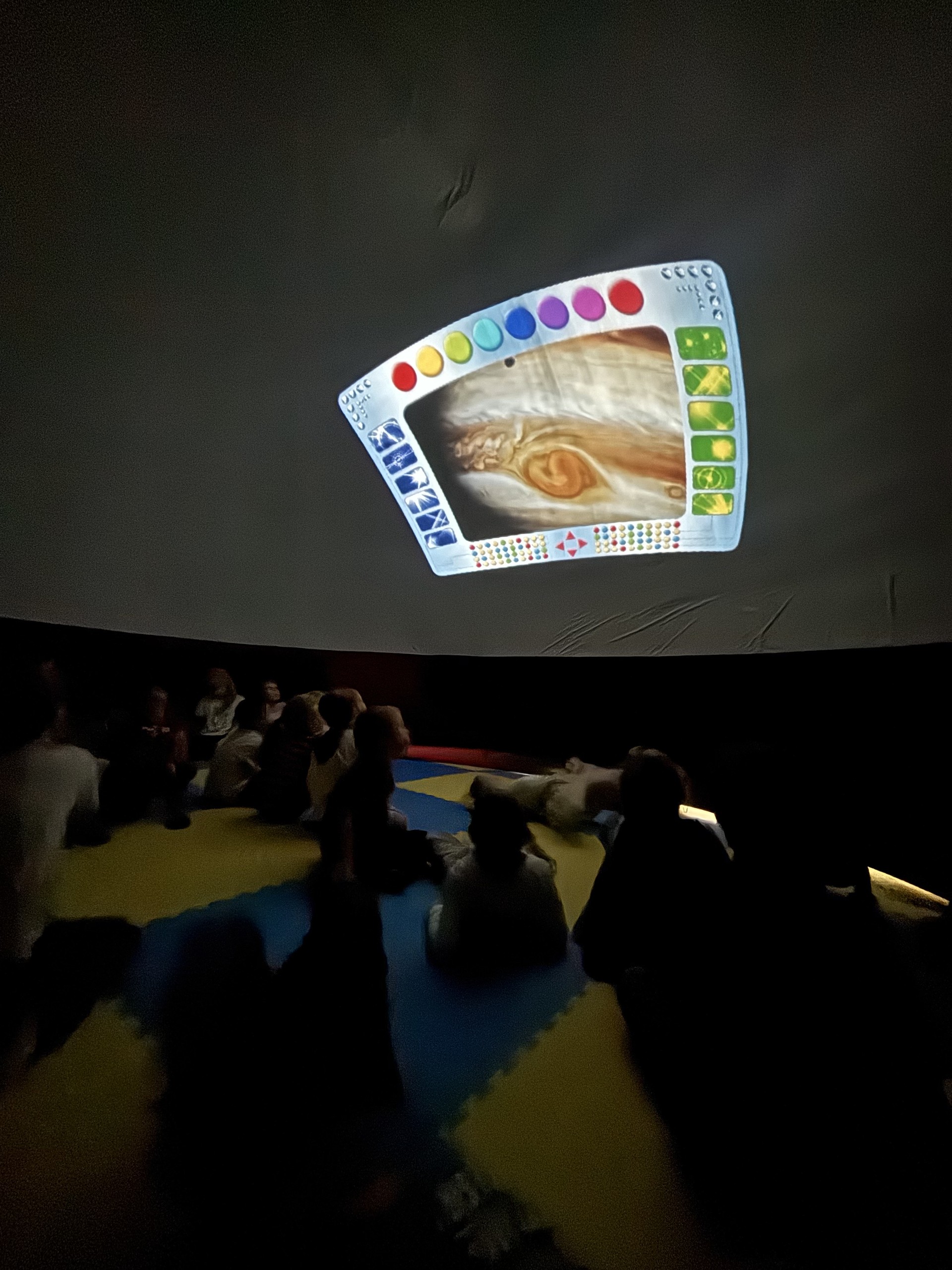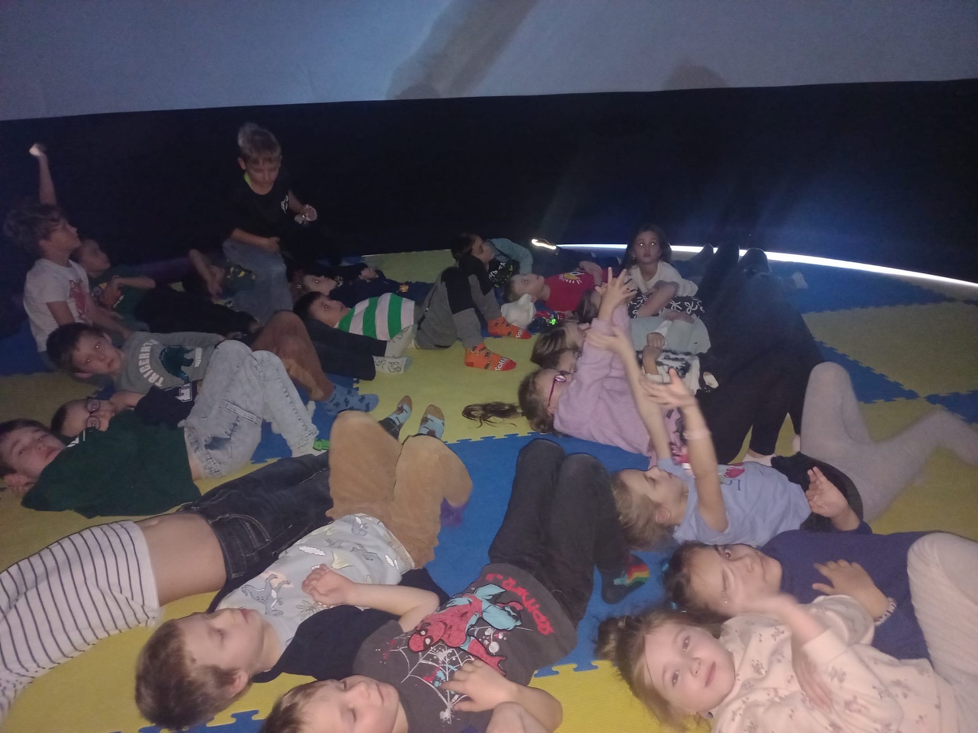 Nejprve jsme se společně ponořili do halloweenského příběhu Frankenstein, který byl lehce strašidelný, ale díky humornému vyprávění paní lektorky se děti u promítání smály a reagovaly s nadšením. Následně jsme se vydali na cestu vesmírem – poznávali jsme planety, hvězdy a souhvězdí a obdivovali krásu nekonečného prostoru nad námi. Děti byly zaujaté a často reagovaly překvapenými výkřiky, zvědavými otázkami i radostnými komentáři.