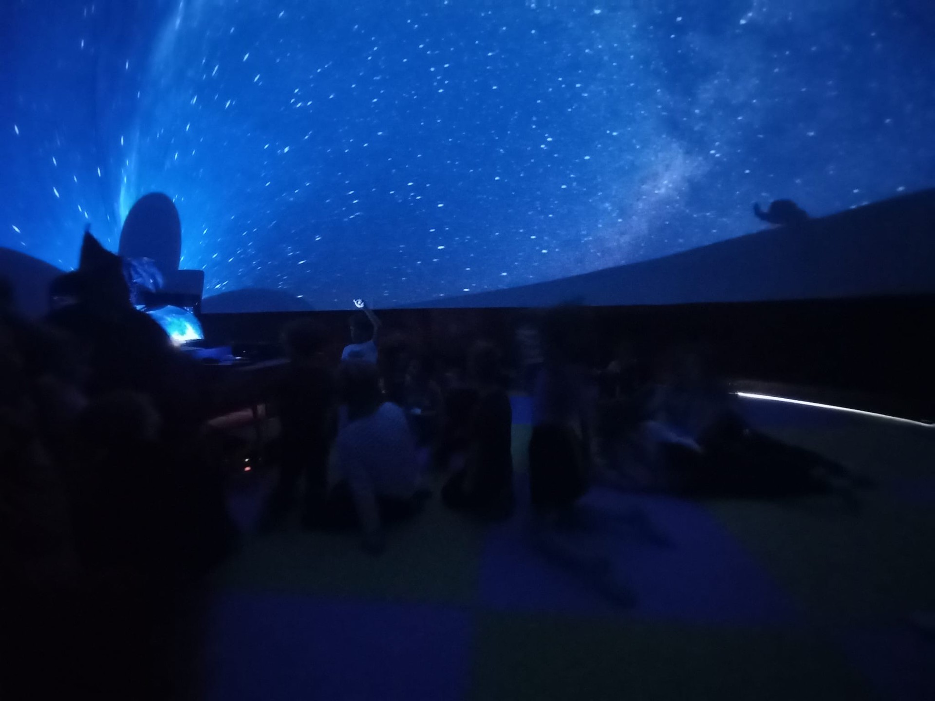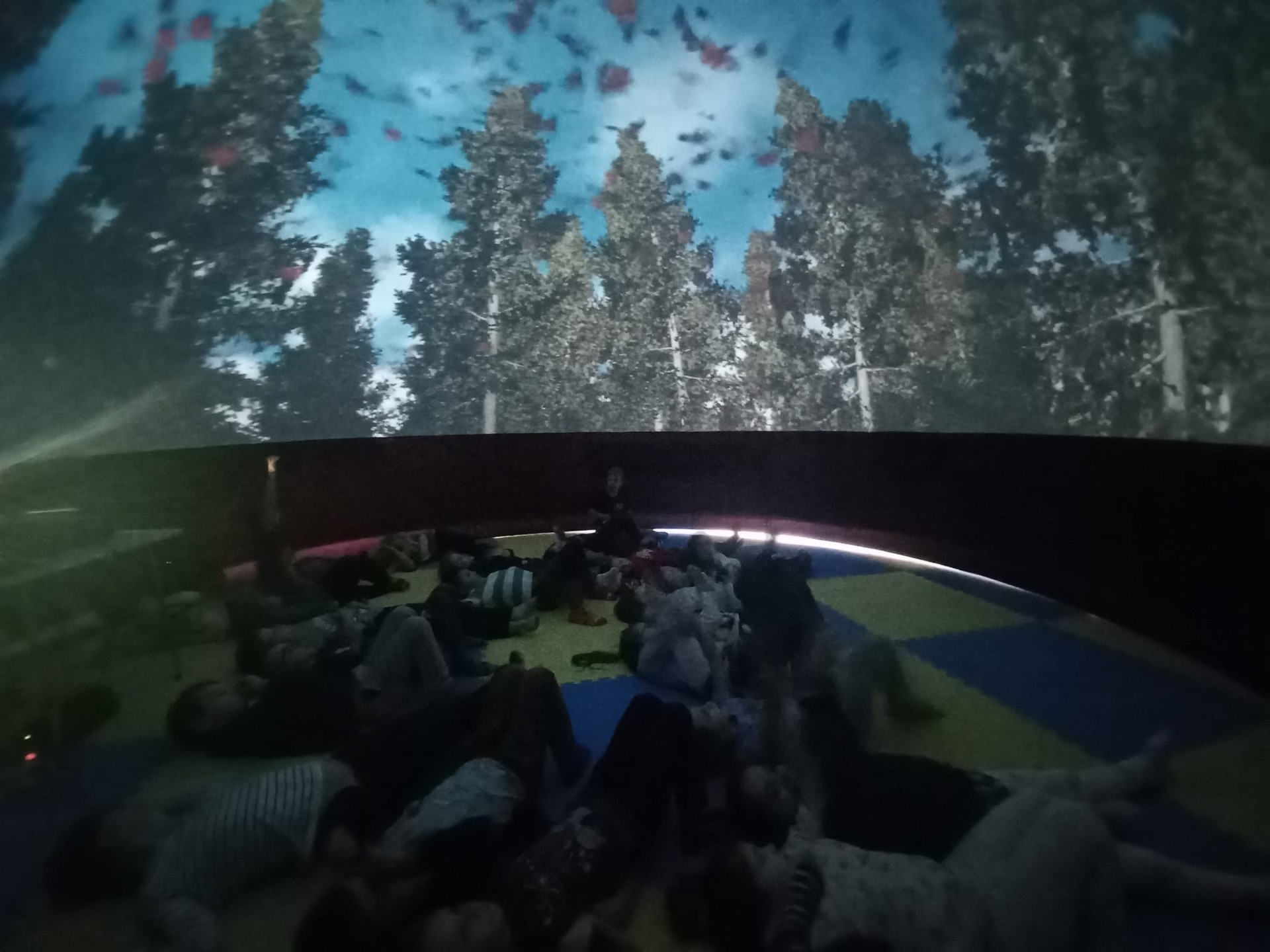 Uvnitř bylo šero a velmi příjemná atmosféra. Strop kopule sloužil jako projekční plocha a obklopil nás obrazem tak, že jsme měli pocit, jako bychom se opravdu ocitli uvnitř příběhů i hvězdného nebe. Program nám poutavě a zábavně komentovala paní lektorka, která dokázala děti nejen vtáhnout do děje, ale zároveň je přirozeně vedla k pozorování a zamyšlení.