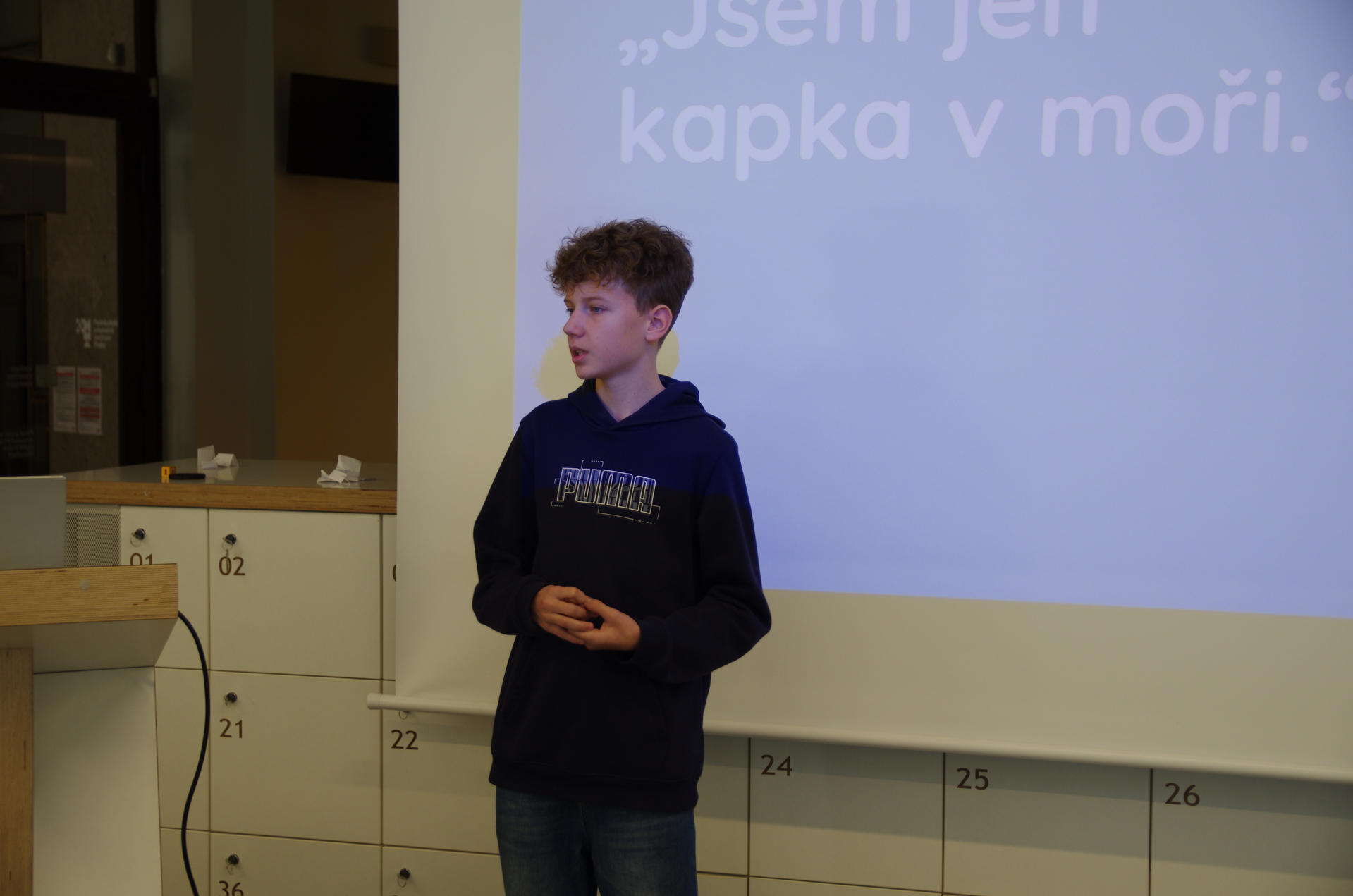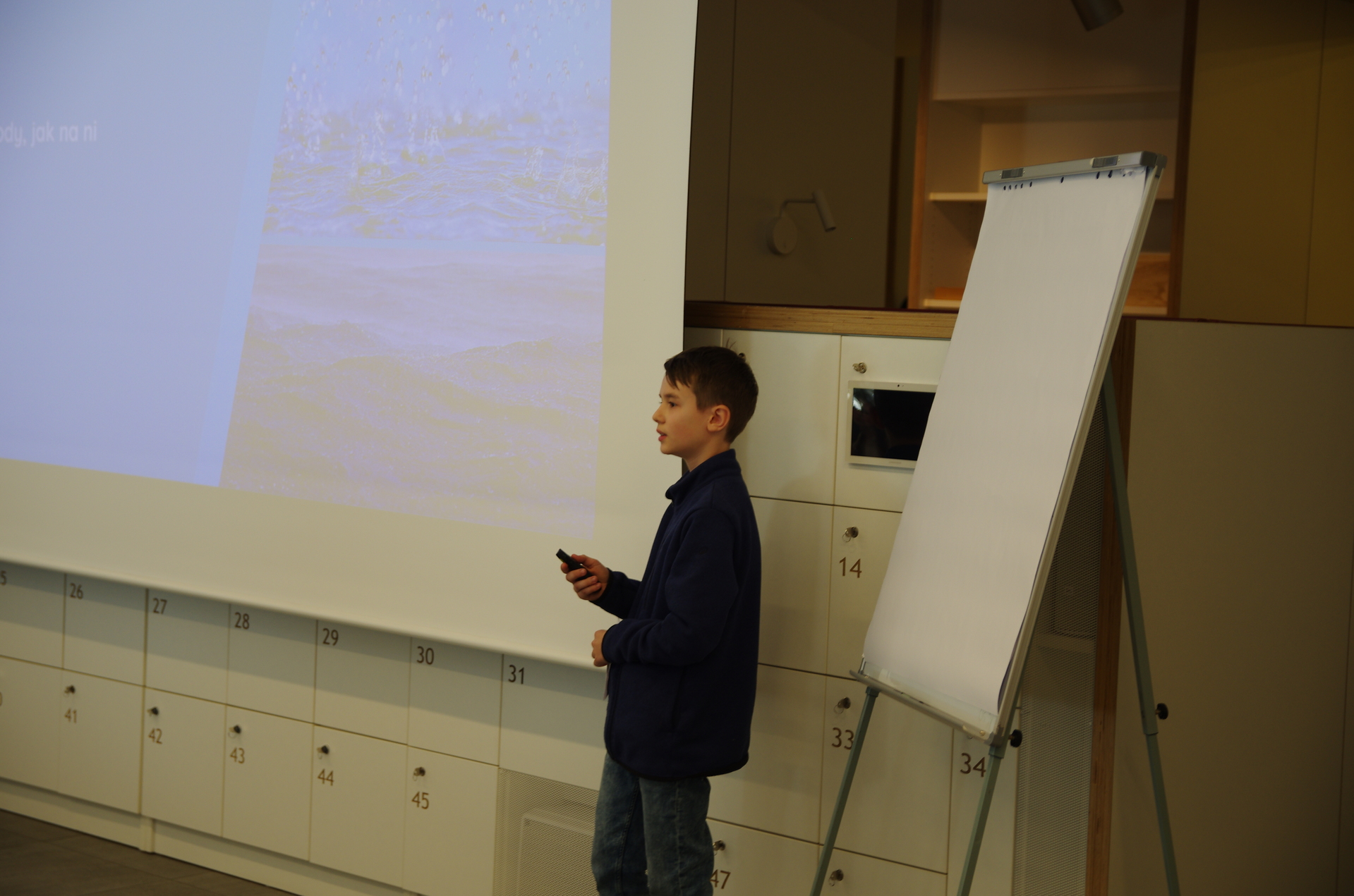 Naši školu reprezentovaly dva týmy. Tým Momentum ze třídy 8. B ve složení Michal a Saša a tým IQ na hraně z 8. A, který tvořily Eliška, Evelína a Maruška. Oba týmy pracovaly na dvou soutěžních tématech – Na hraně a Kapka v moři. Žáci se museli vypořádat nejen s obsahem prezentace, ale také s jejím vizuálním zpracováním a samotným vystupováním před publikem.