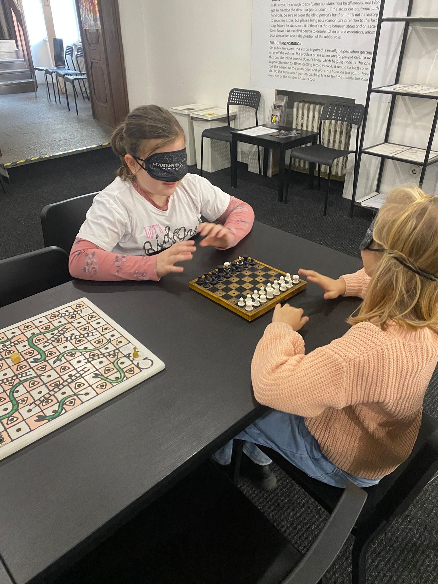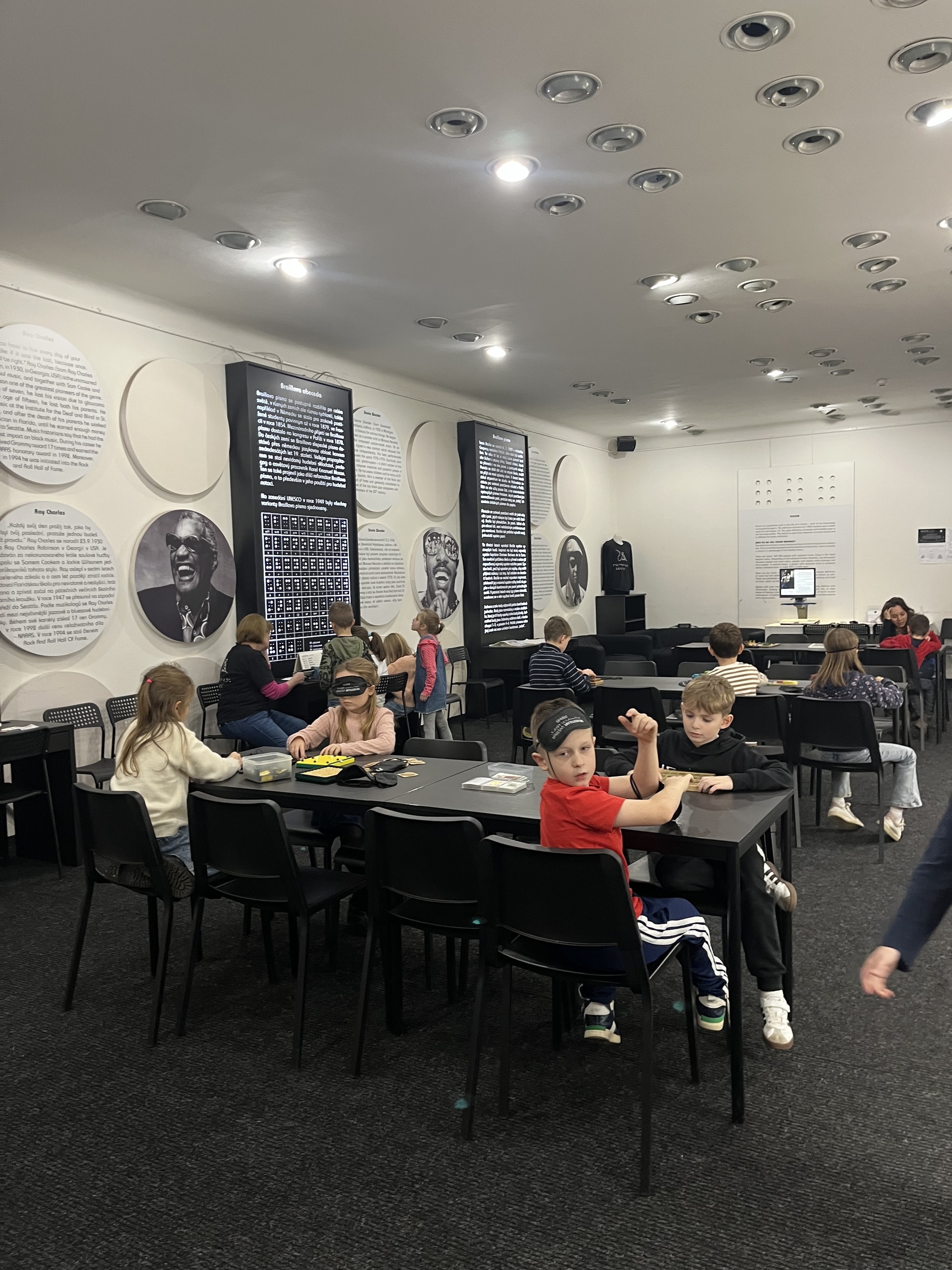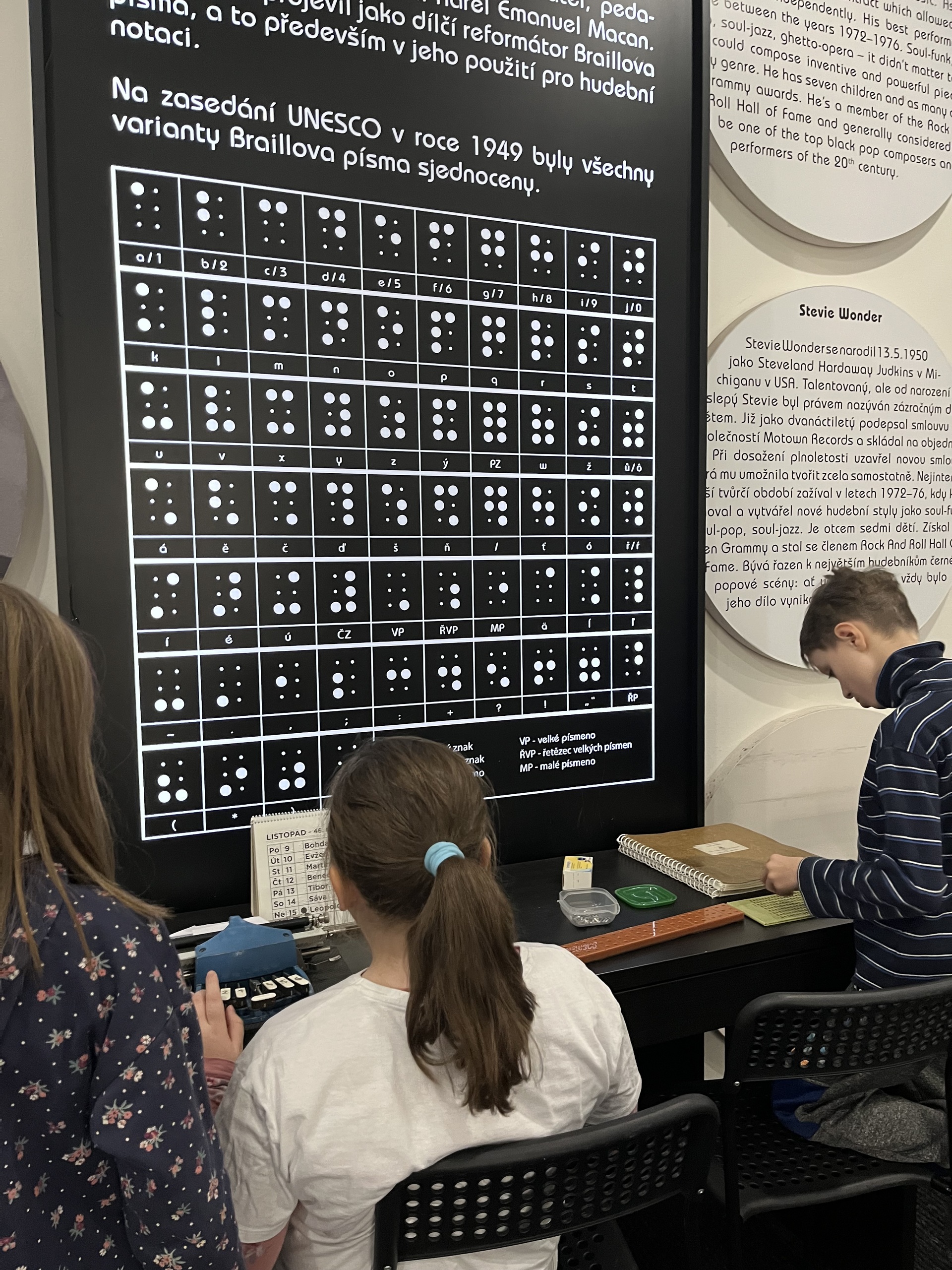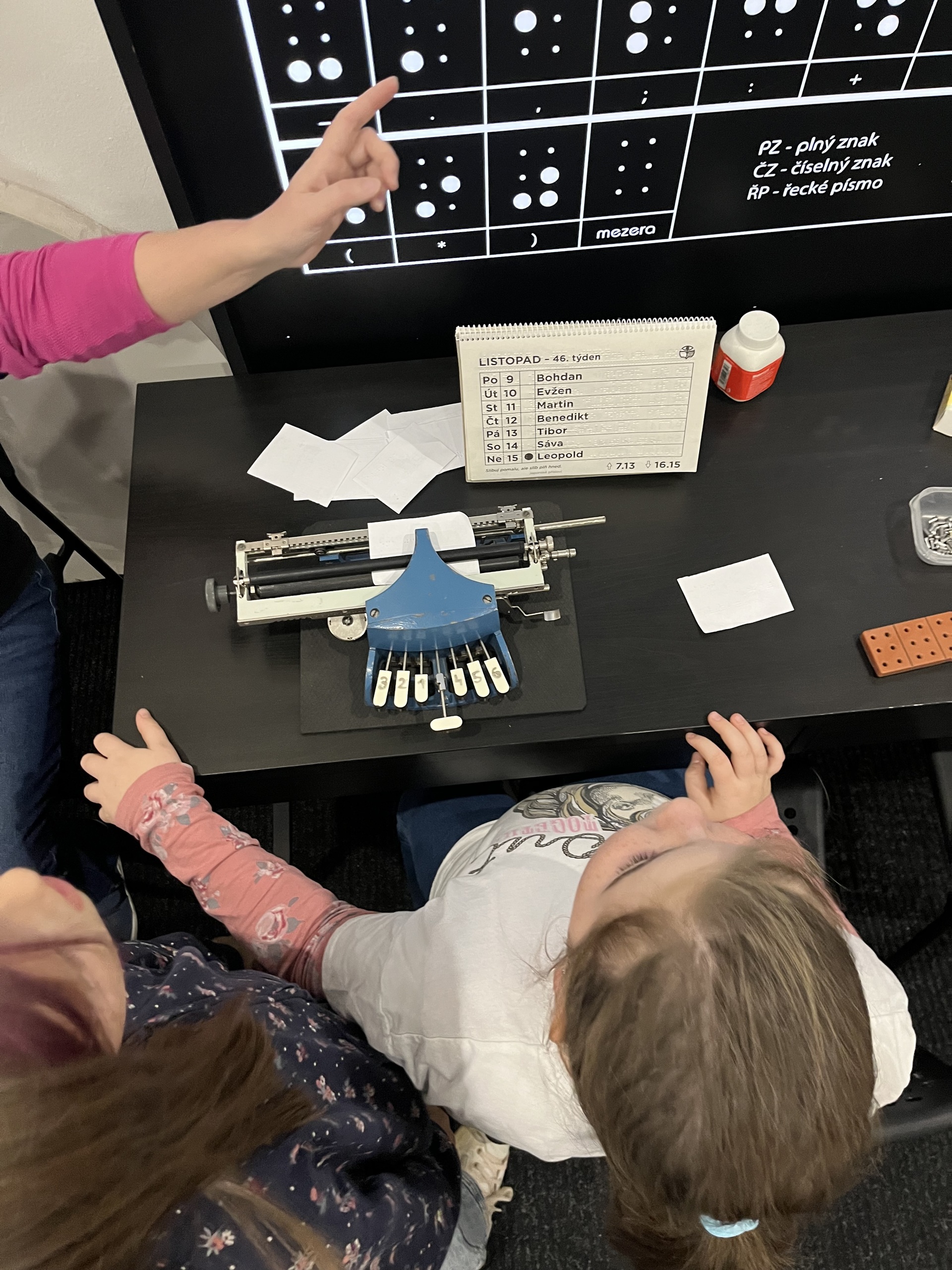 Ve druhé, již osvětlené části, měly děti možnost vyzkoušet si různé hry pro nevidomé, stavět lego poslepu a vyzkoušet si číst i psát Braillovým písmem.