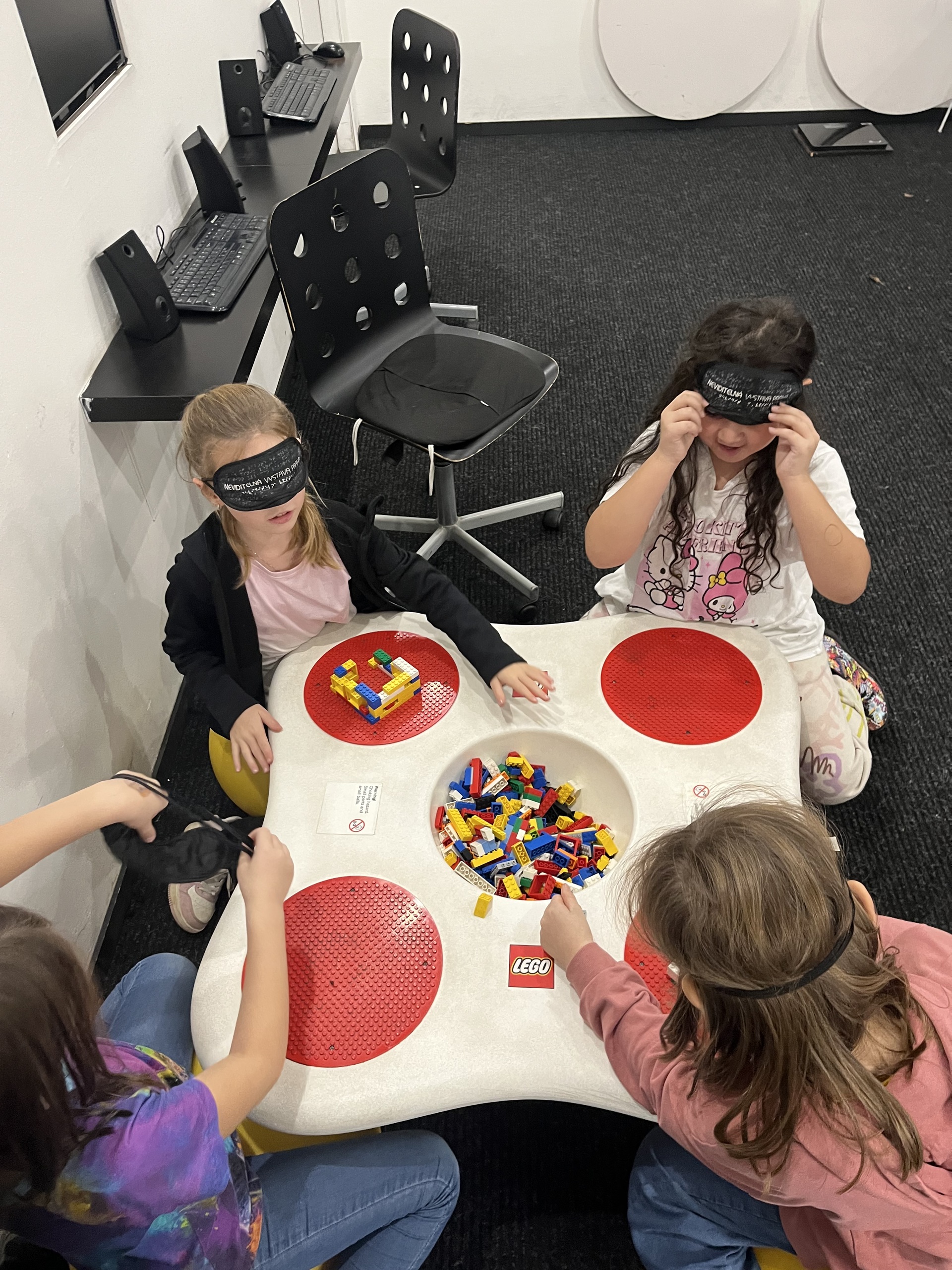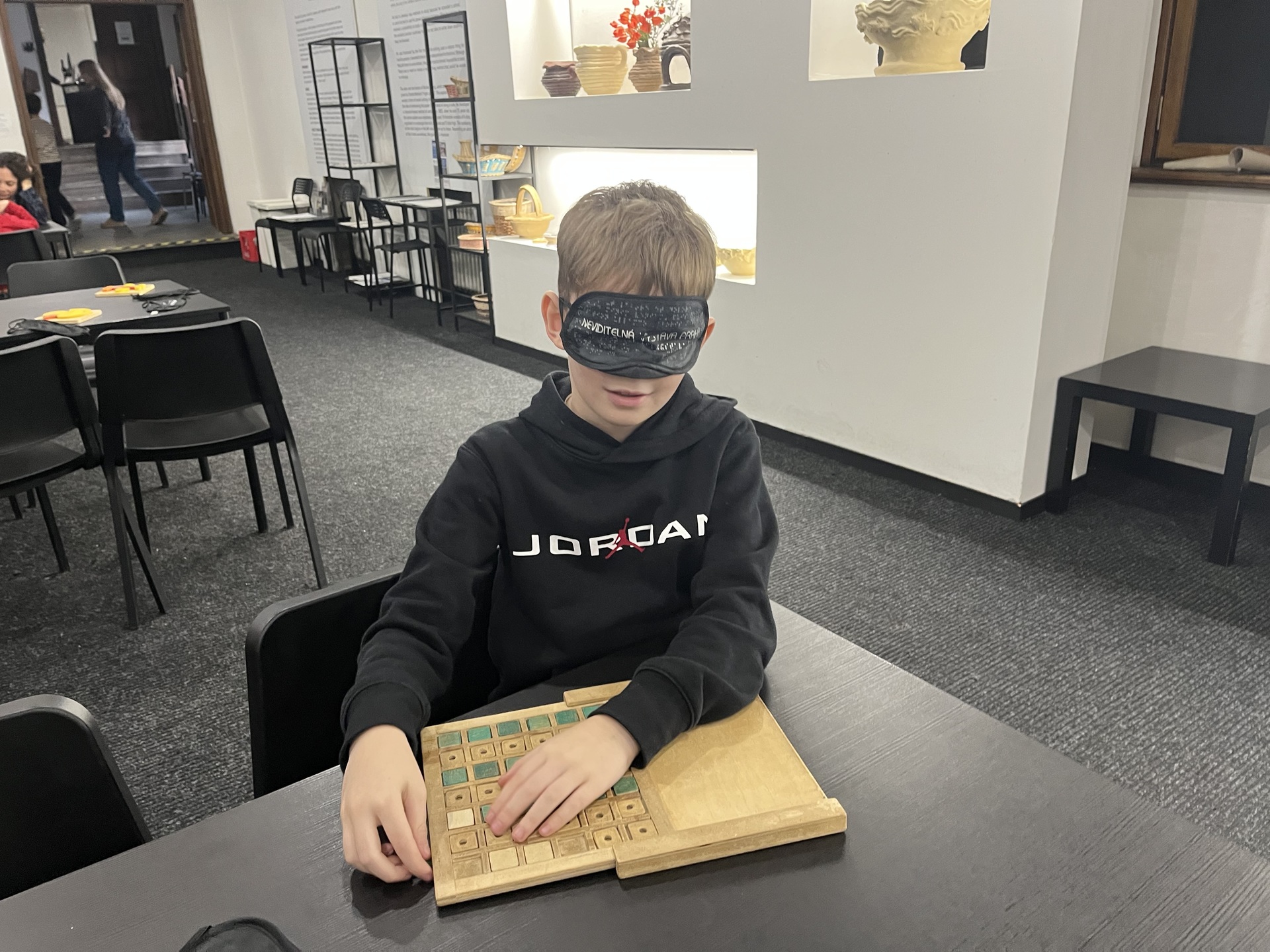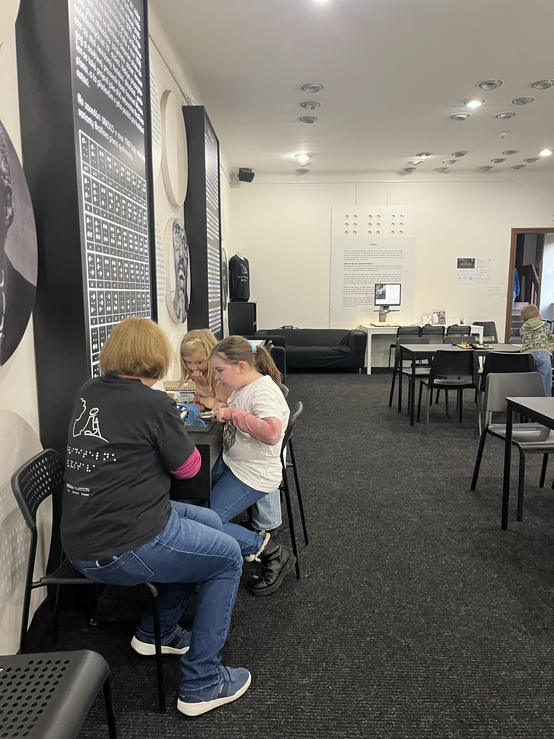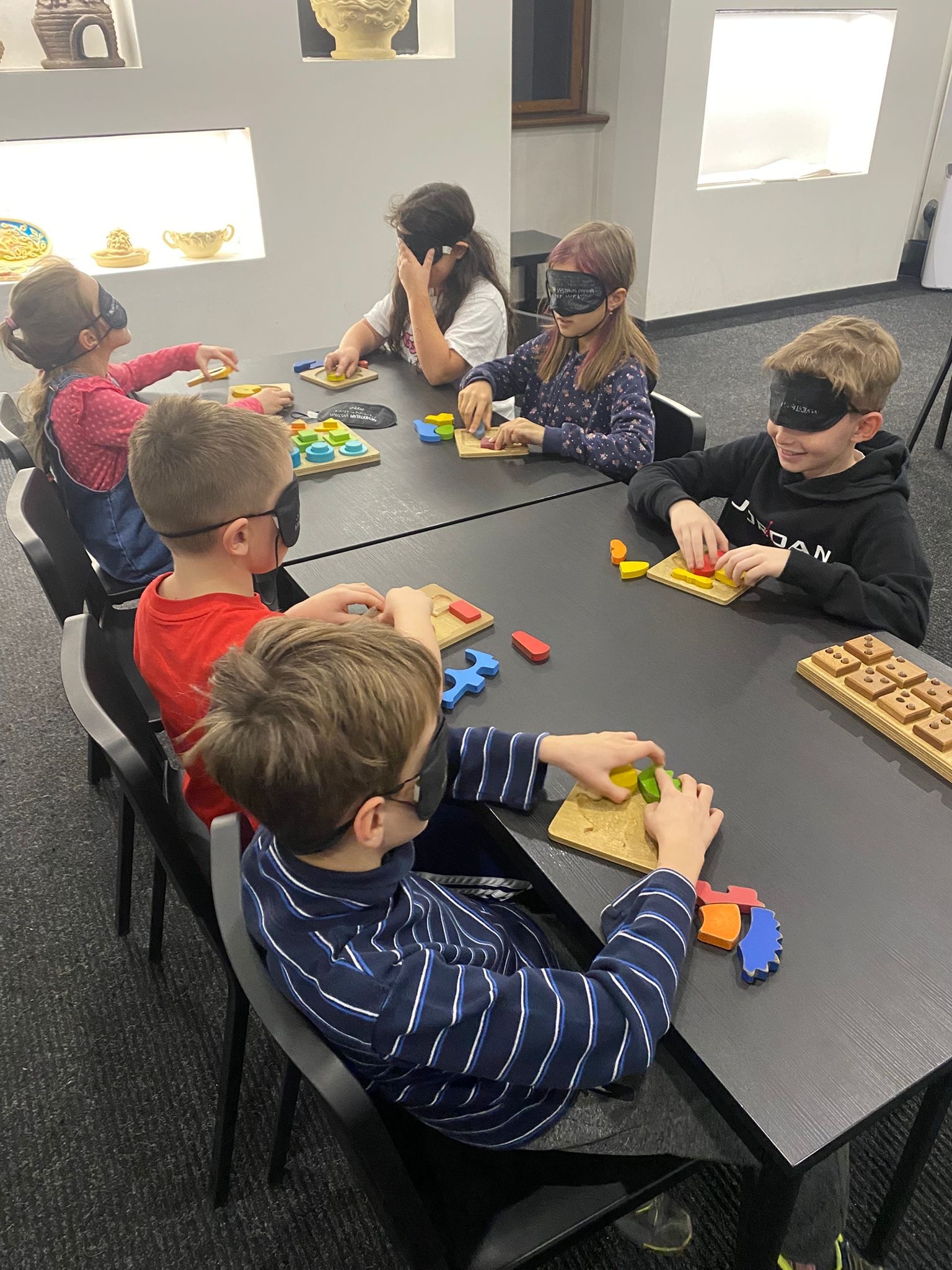 Ve druhé, již osvětlené části, měly děti možnost vyzkoušet si různé hry pro nevidomé, stavět lego poslepu a vyzkoušet si číst i psát Braillovým písmem.