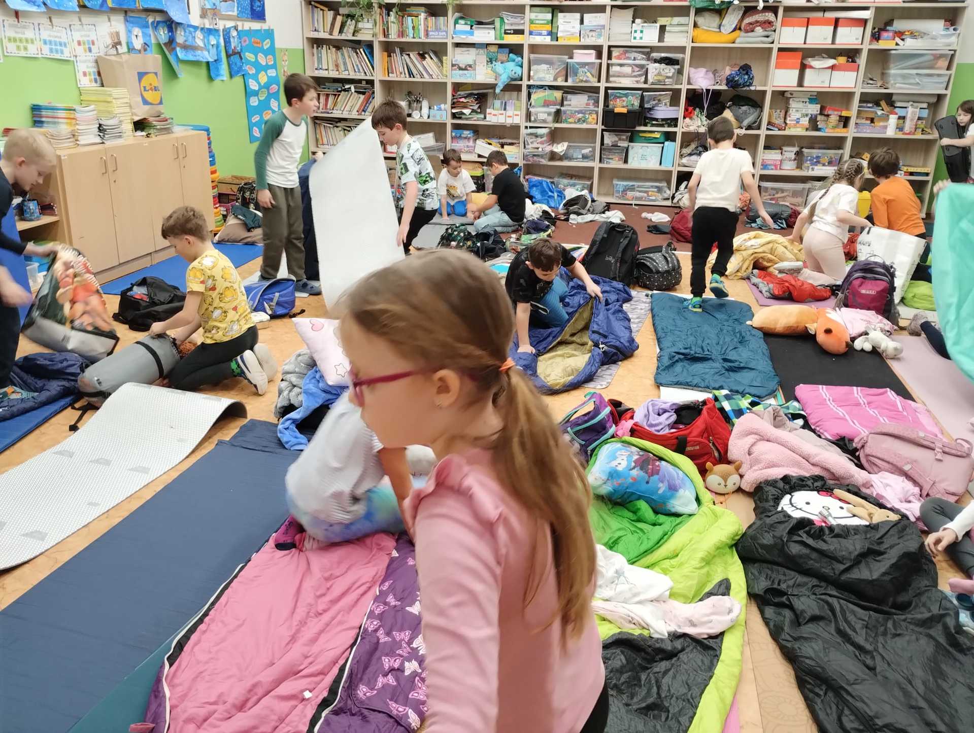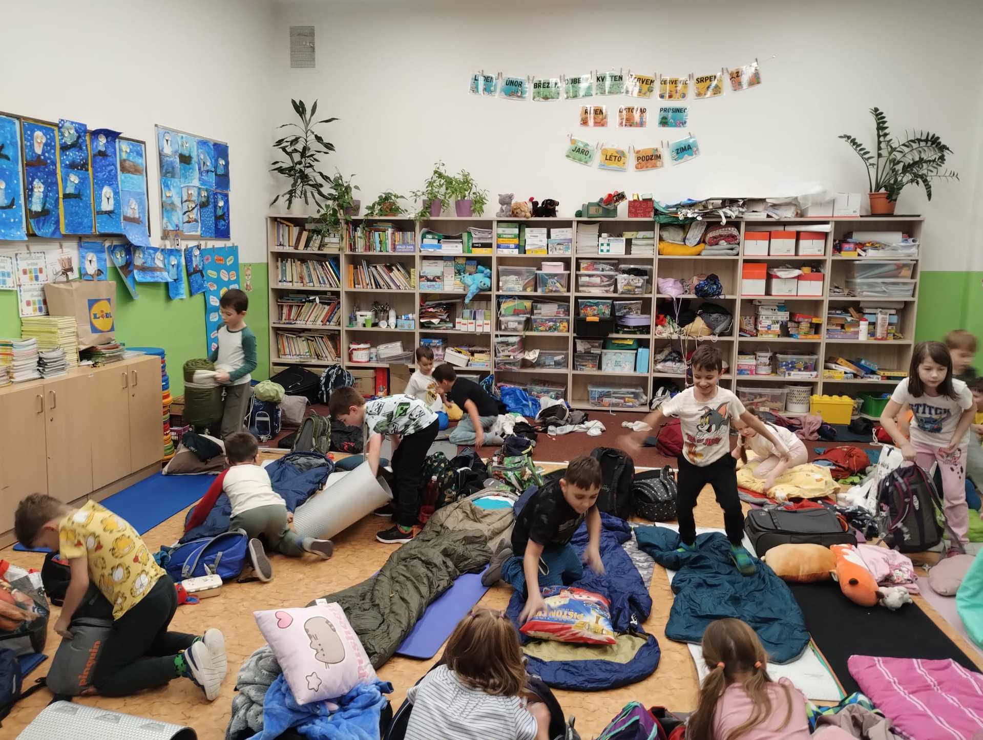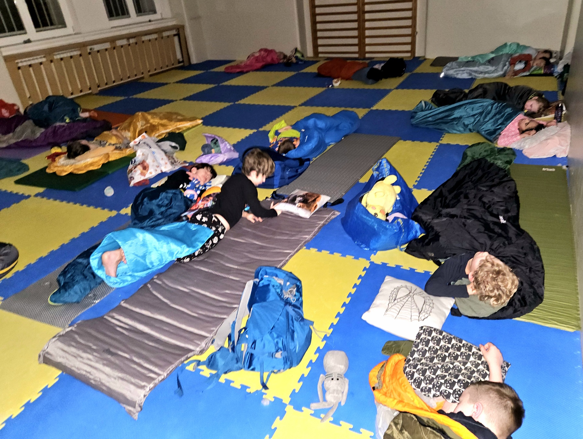 Když se venku setmělo, přišel čas na kouzelnou část večera – pohádkovou cestu školou. Děti procházely ztemnělými chodbami, kde na ně čekaly úkoly a příběhy, které prověřily jejich odvahu i fantazii. Po velkém dobrodružství následovalo zasloužené zklidnění. Všichni jsme se zachumlali do spacáků a společně se podívali na krátkou pohádku, která byla tou nejlepší tečkou na dobrou noc.